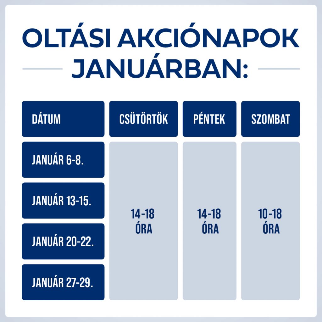 Az átoltottság további növelése és a járvány újabb hullámának megfékezése érdekében januárban minden csütörtök és péntek délután, és szombaton lesz oltási akció a kórházi oltópontokon és a kijelölt járásközponti szakrendelőkben, emellett a háziorvosok is szerveznek oltási akciónapokat. Az első oltási akció január 6. csütörtök és január 8. szombat között lesz.